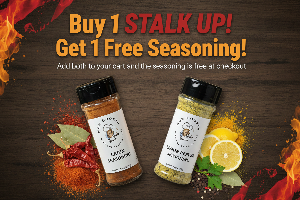 "Buy 1 STALK UP!, Get 1 Free Seasoning! Add both to your cart, and the seasoning is free at checkout."